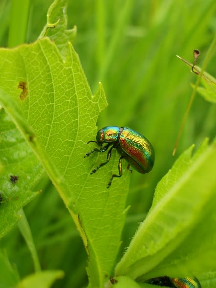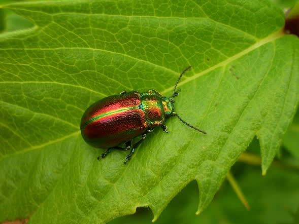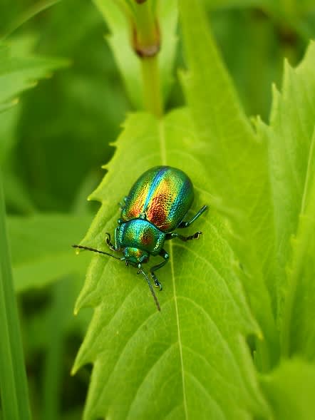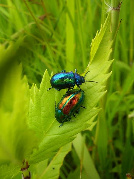 6月30日撮影、青森県三沢市のオオルリハムシ(Chrysolina virgata)。